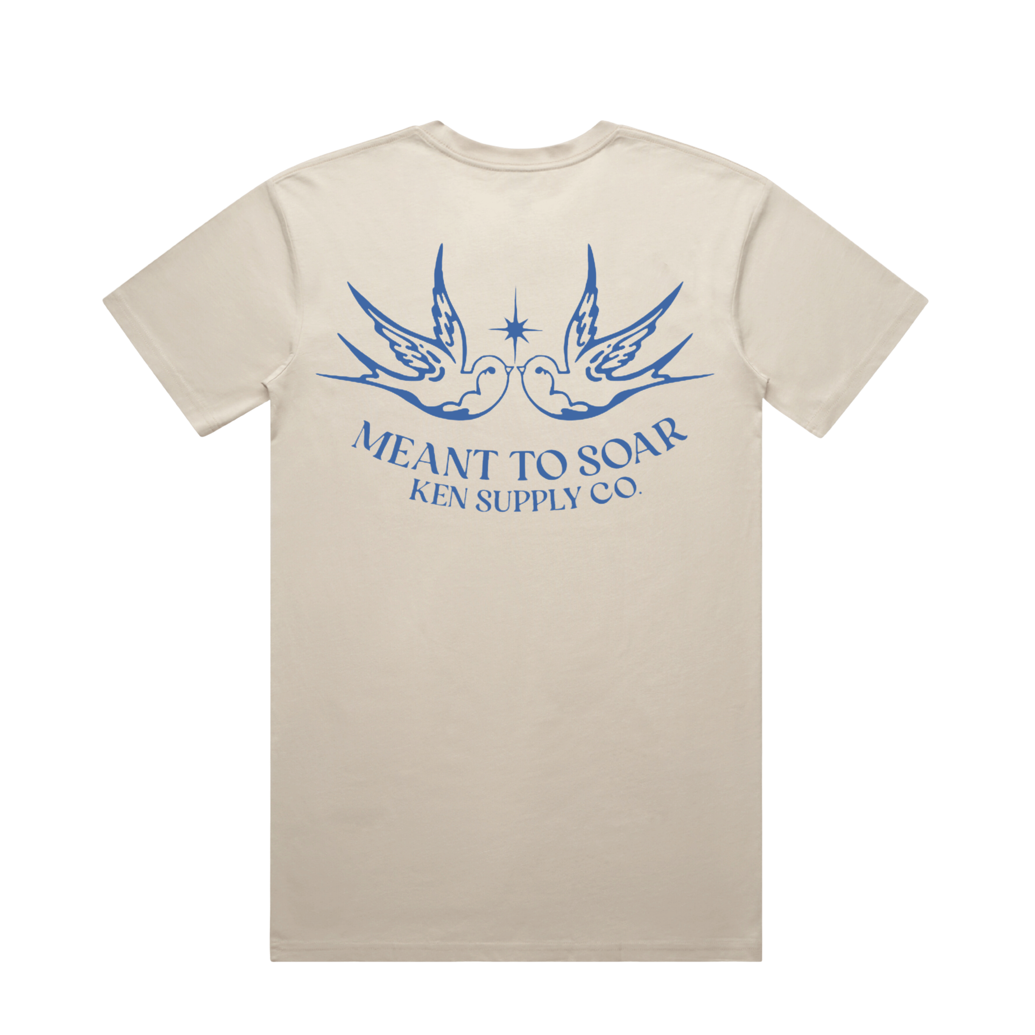 Meant to soar. The Swallows Tee is a tribute to freedom, movement, and the journey ahead. Featuring two swallows in flight on the back with the phrase "Meant to Soar," this tee is a reminder to keep chasing what sets you free. The front left chest keeps it simple with a single swallow, adding a timeless touch to the design.