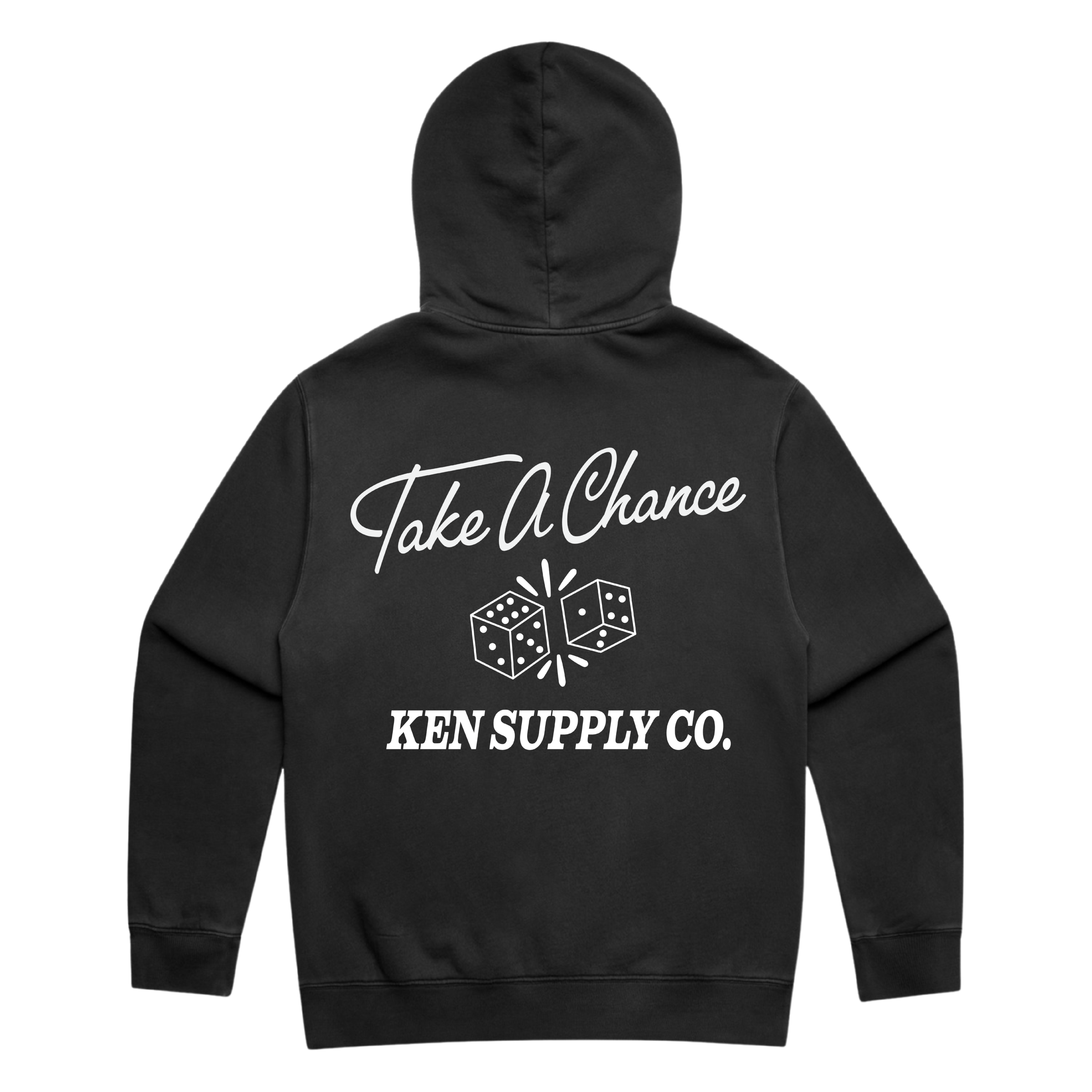 Take a chance. The Dice Hoodie features a pair of dice and the phrase "Take a Chance" on the back, a nod to risk, reward, and going all in. Ken Supply Co. is printed alongside the design, keeping it bold yet timeless. The front keeps it minimal with a small dice graphic on the left chest.