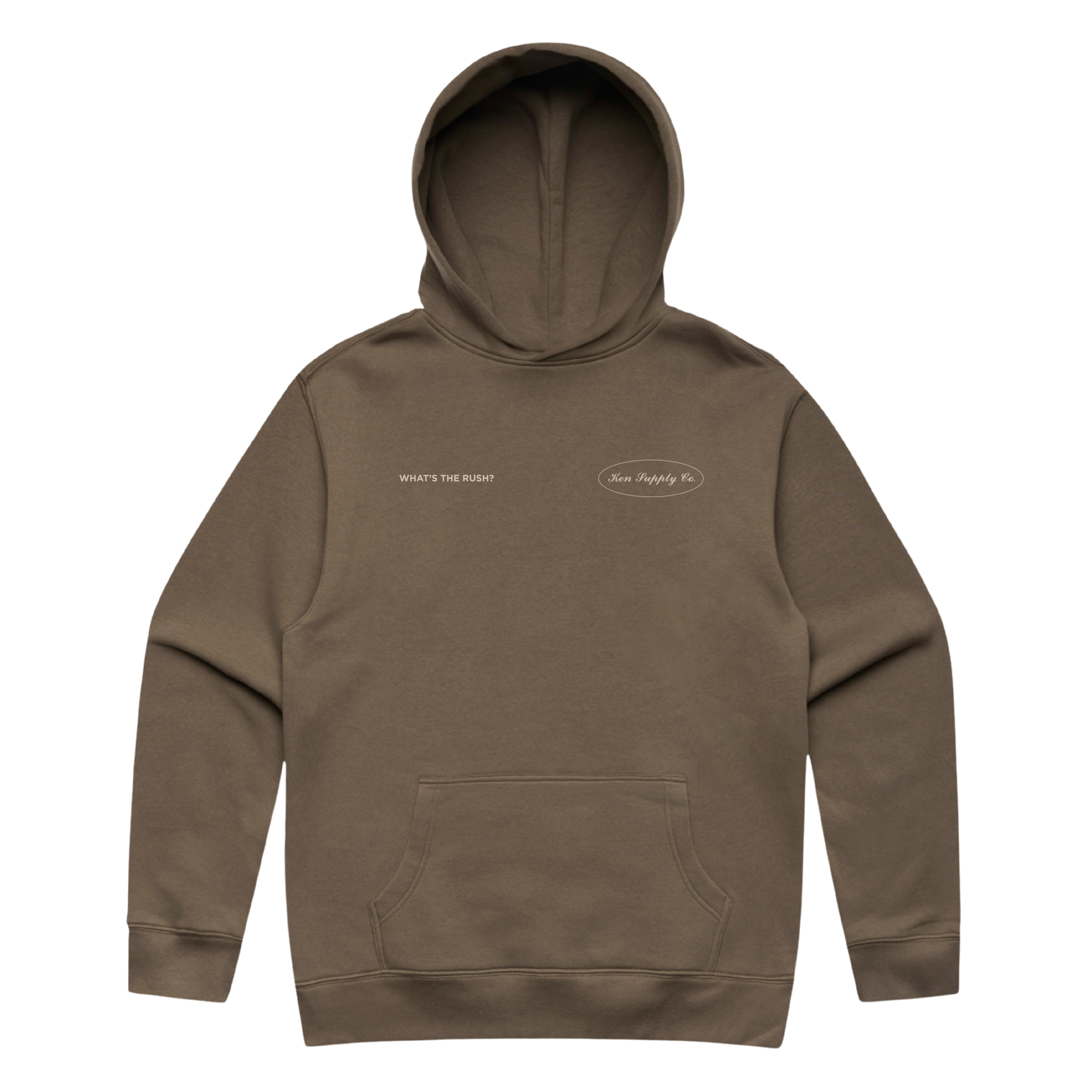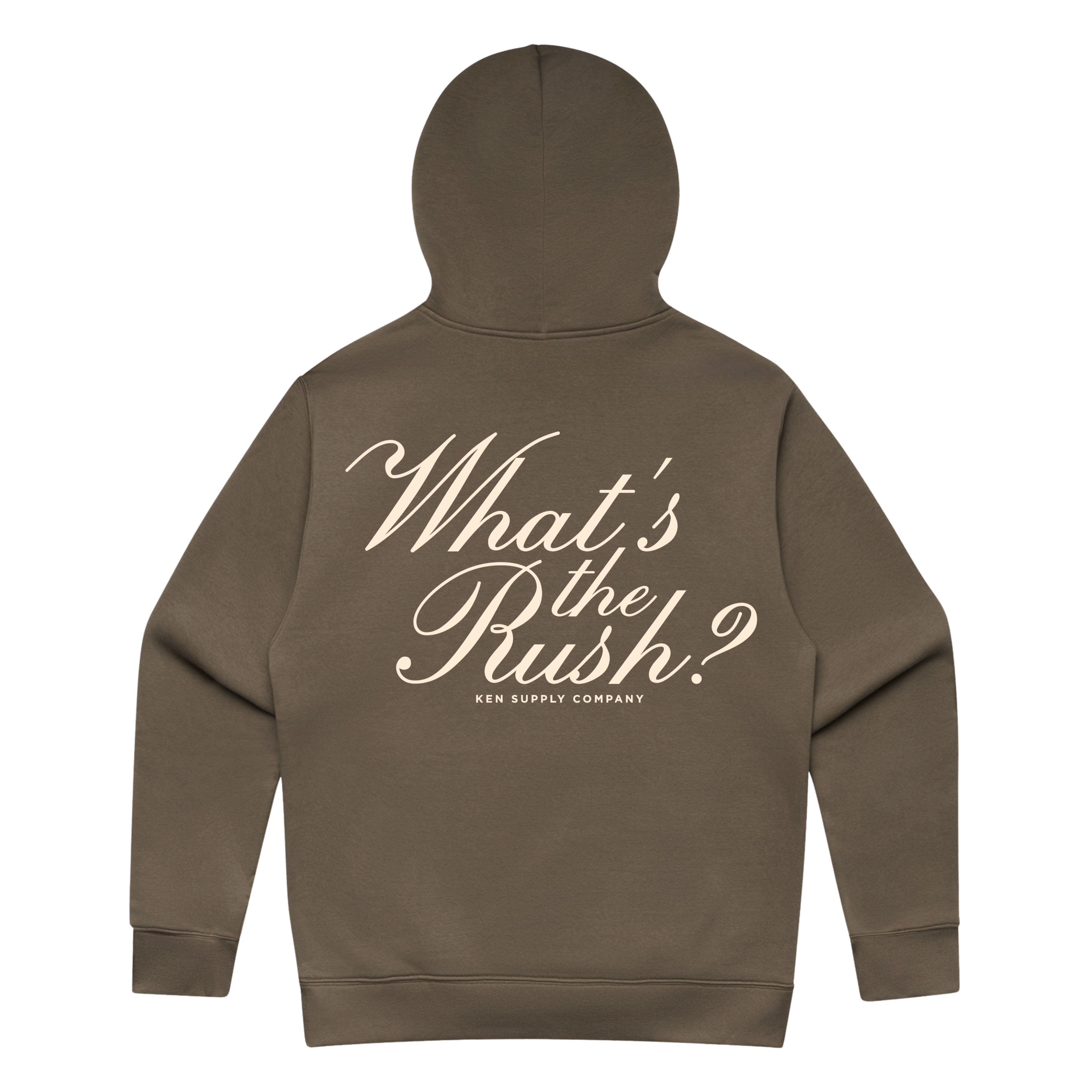 What’s the rush? This hoodie is your daily reminder to slow it down and move with purpose. The back features the phrase “What’s the Rush” in bold script, nudging you to be more intentional with your time, energy, and direction. The front pairs that same phrase on the chest with the Ken Supply Co. emblem, grounding the piece in everyday meaning.