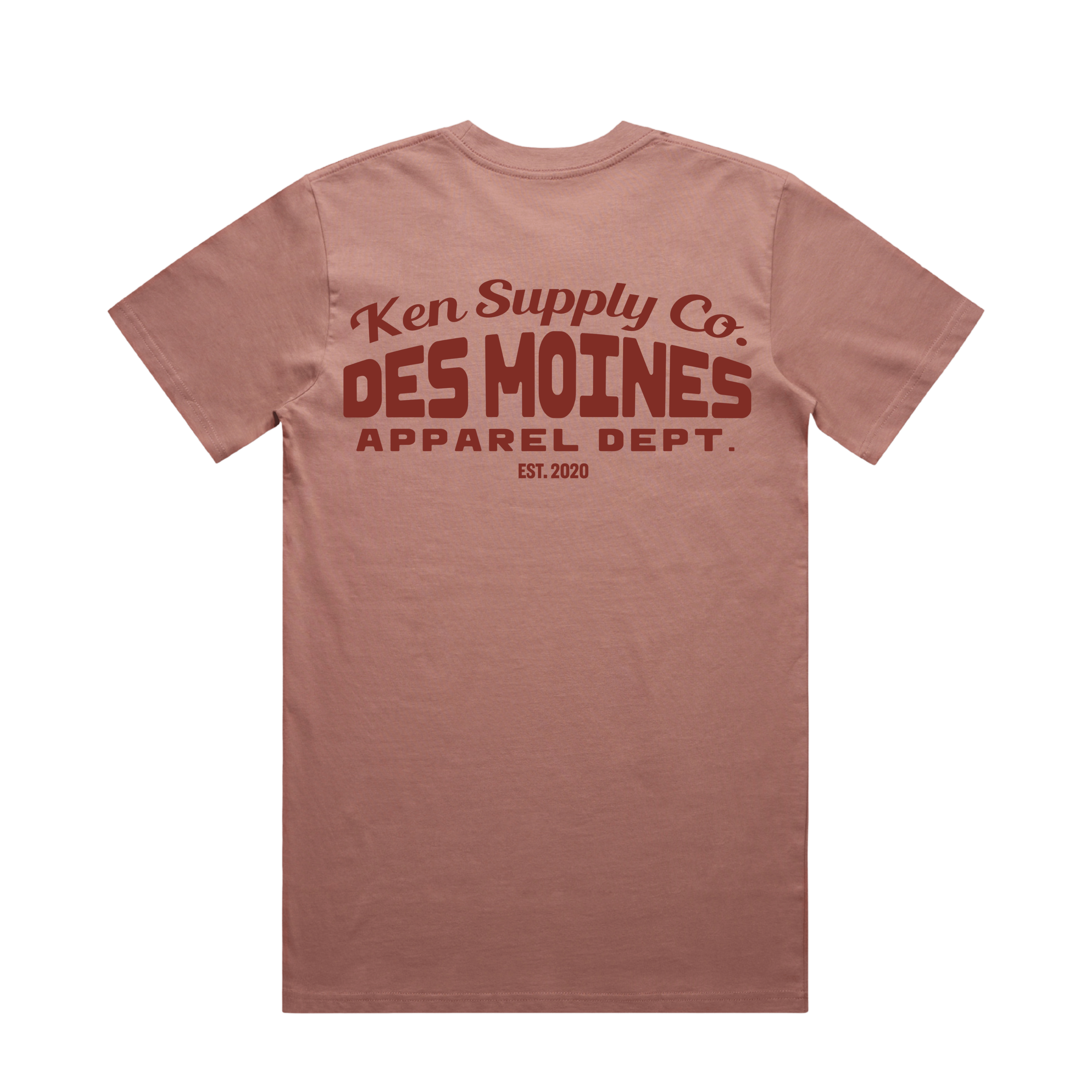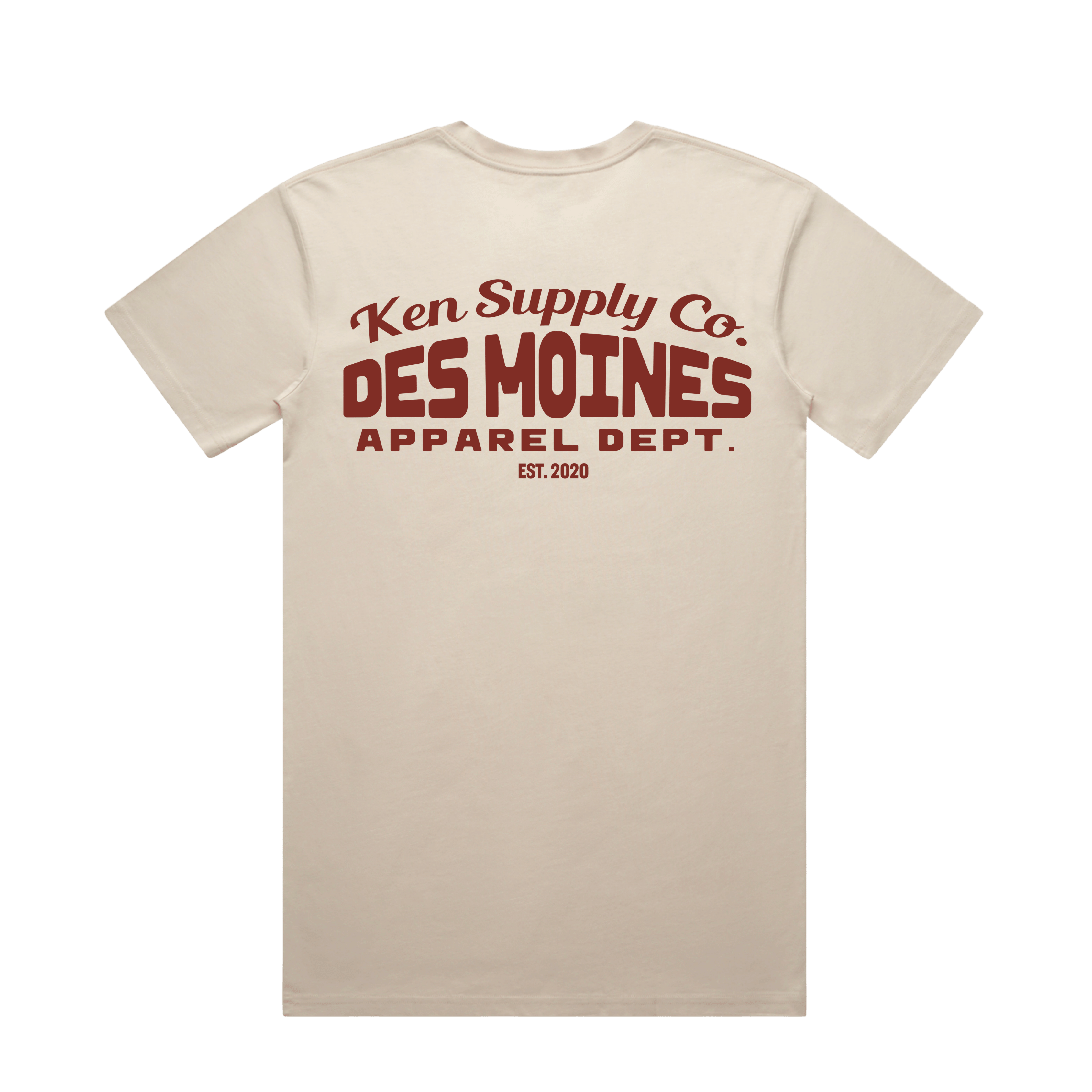 Rooted in heritage, built for the future. The Des Moines Tee pays homage to the city with a bold back print featuring "Des Moines Apparel Dept." alongside Ken Supply Co. branding. The front left chest keeps it minimal with a smaller matching print for a clean, understated look.