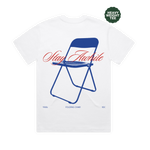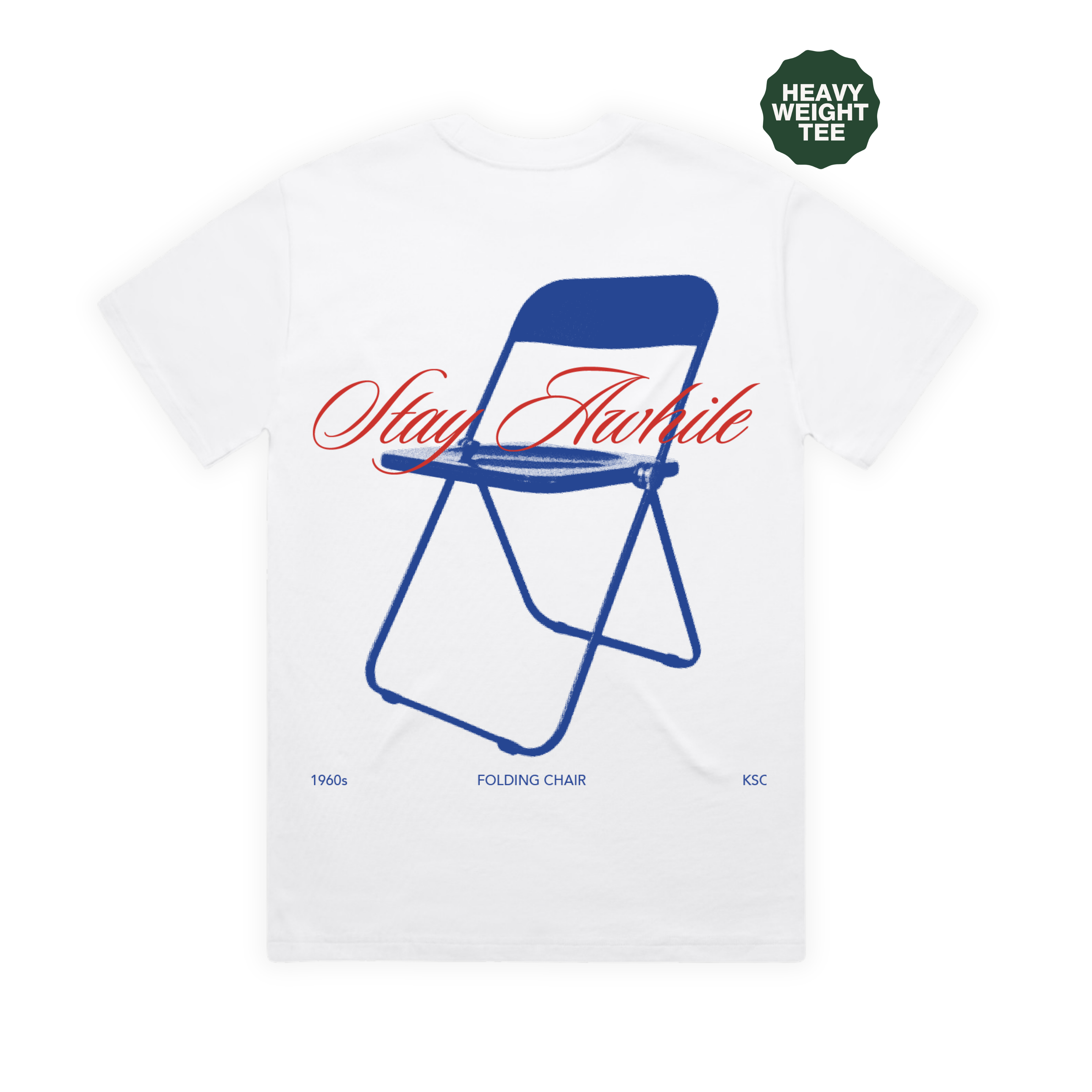 Stay awhile. A reminder to slow down, be present, and make space for connection. Inspired by shared moments and everyday community, this tee features a vintage 1960s blue folding chair on the back with Stay awhile printed above it in red. The chair represents approachability and openness, pulling up an extra seat, lingering a little longer, and appreciating where you are.
